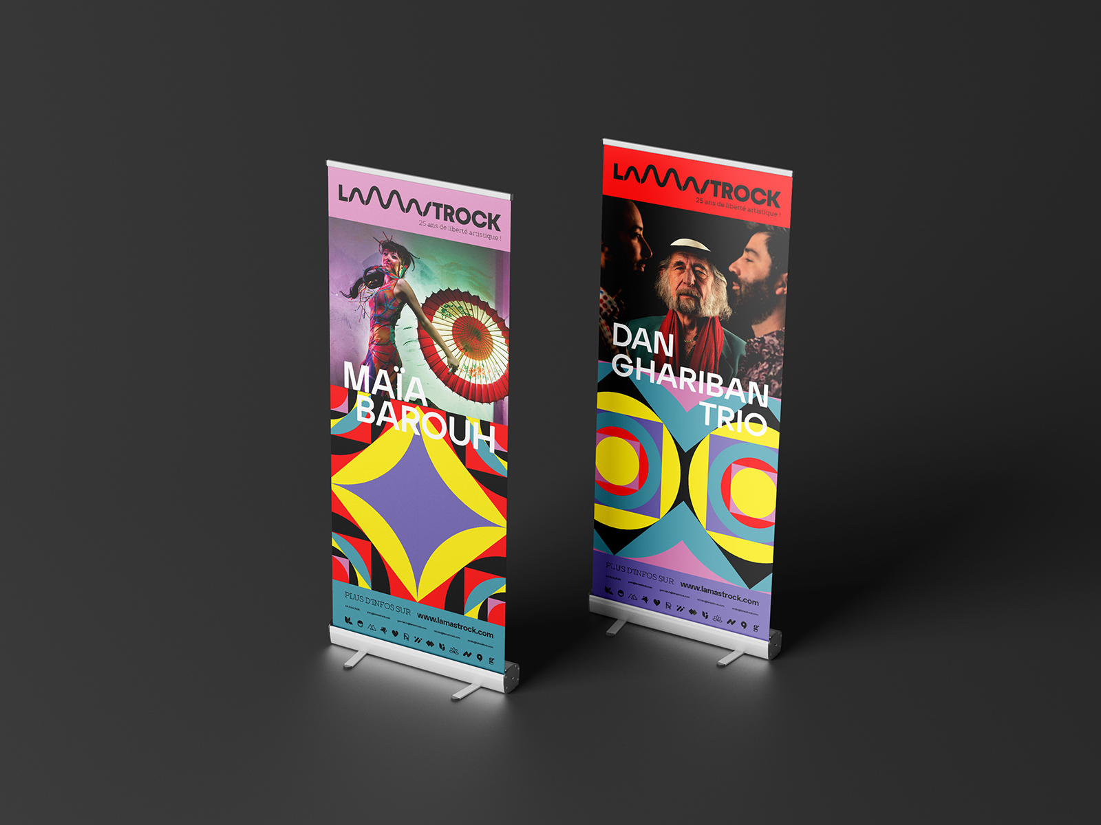 Refonte de l’identité visuelle de @lamastrock (logotype, programme, bannière du site web/réseaux sociaux et page pub) + propositions de déclinaisons (roll-up, badge staff et affiche)